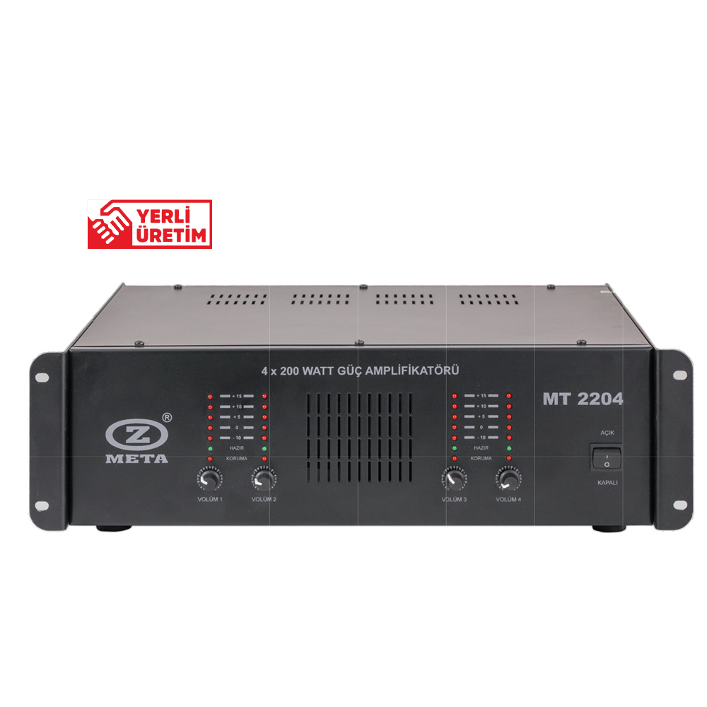 ► 4 x 200 W /toplamda 800 watt 100 V amplifikatör çıkış gücü ► Sinyal giriş: 4X100 mV (Max lV) ► Led’ li vumetre, ► DC HP. koruma. ► Çıkış kısa devre koruma. ► Hat trafolu (100 volt) ► Acil anons girişi ve kontrolü. MT 2112 kullanıldığında sistem ve volümler kapalı olsa dahi acil anons otomatik olarak yapılır. ► AC Giriş: AC 220 V 50 Hz. ► Montaj: 19″ Rack Kabin Standartına Uygun ► Ölçüler: 440 x 260 x 90 (mm) ► Ağırlık: 18.5 kg