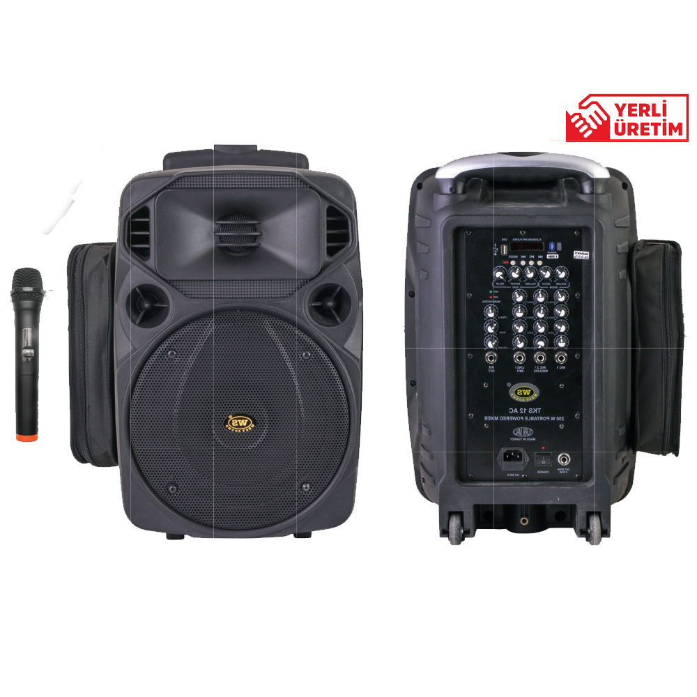 ► 300 Watt Amplifikatör çıkış gücü. Harici Hoparlör çıkış empedansı 8 D. ► 4 kanal 3 Mikrofon (2mV) ve 1 Line girişi (30mV). ► Dijital sonsuz ayarlı reverb ve dijital eko (ayrı ayrı kullanılabilir). ► USB girişli MP3 çalar, bluetooth bağlantı, uzaktan kumanda, USB belleğe kayıt. ► UH F el tipi telsiz mikrofon 1 adet+ telsiz yaka (headset aparatlı) 1 adet. ► Dahili 38 cm. Hoparlör (15″ 300W bass + 1″ tweeter). ► AC Giriş: AC 220 V 50 Hz. / DC 12 V Şarjlı Akülü (12V/7A-9A) Harici 12 V ile Çalışma ► Ölçüler: 670 x 410 x 360 (mm) ► Ağırlık: 22 kg